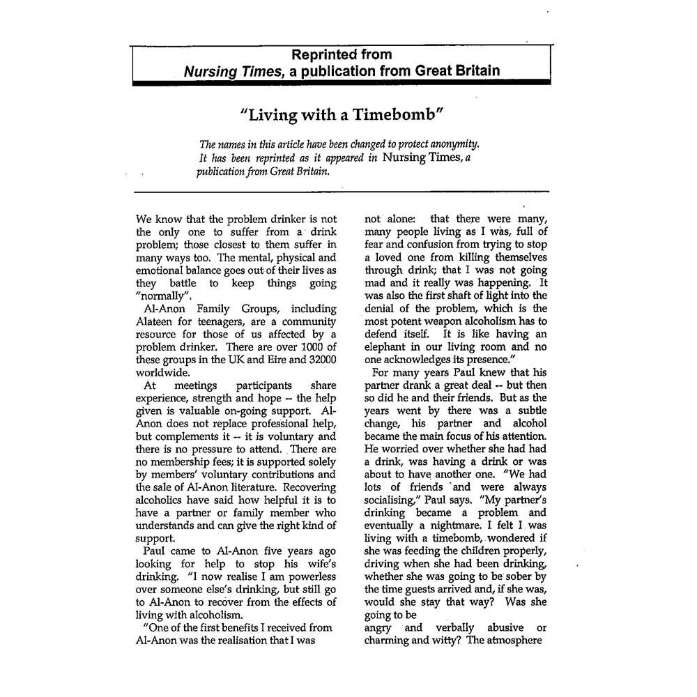 Reprinted from Nursing Times, a publication from Great Britain. One main theme is: ‘Recovering alcoholics have said how helpful it is to have a partner or family member who understands and can give the right kind of support.’ The time bomb, though, is a way of describing the environmental strain experienced inside the family home prior to a recovery journey (or in some homes, journeys).