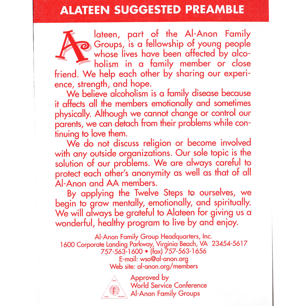 The Alateen Program card is a pocket-strength, and a replica, of the suggested welcome that Alateen members might hear when attending an Alateen meeting, plus it sets out the Twelve Steps, the Twelve Traditions of Alateen groups, and the Serenity Prayer.