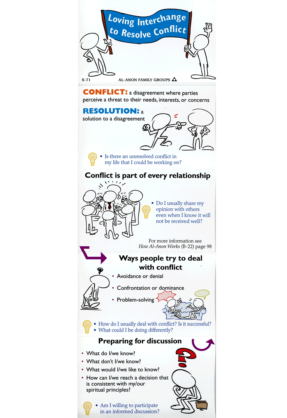 The 'Loving Interchange to Resolve Conflict' nifty wallet-sized, fold-down item of CAL is a great tool for a meeting topic - and then members want their own copy to take home and study further.