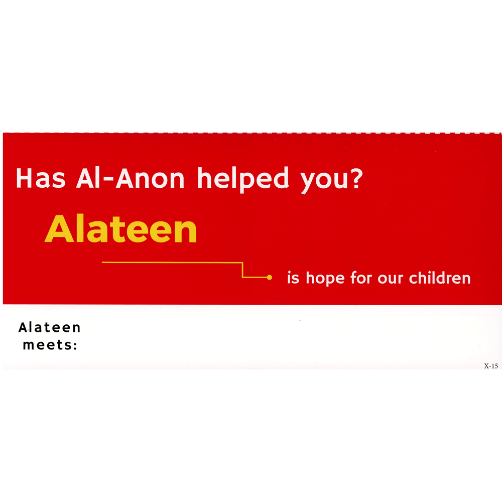 The Alateen (table card) reminds Al-Anon members that Alateen is available for their children. Space is provided to fill in the location, day, and time of the nearest Alateen meeting.